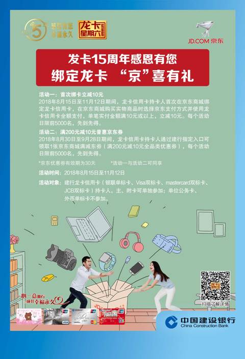 2.活动一活动时间为2018年8月15日至2018年11月12日,仅限从未在京东支付绑定建行龙卡信用卡用户在京东商城购买实物商品时使用。使用时,必须通过京东支付选择建行龙卡信用卡全额支付,单笔实付金额满10元或以上,立减10元。每活动日优惠限量5000份,先到先得,活动期间同一持卡人最多可以享受一次。